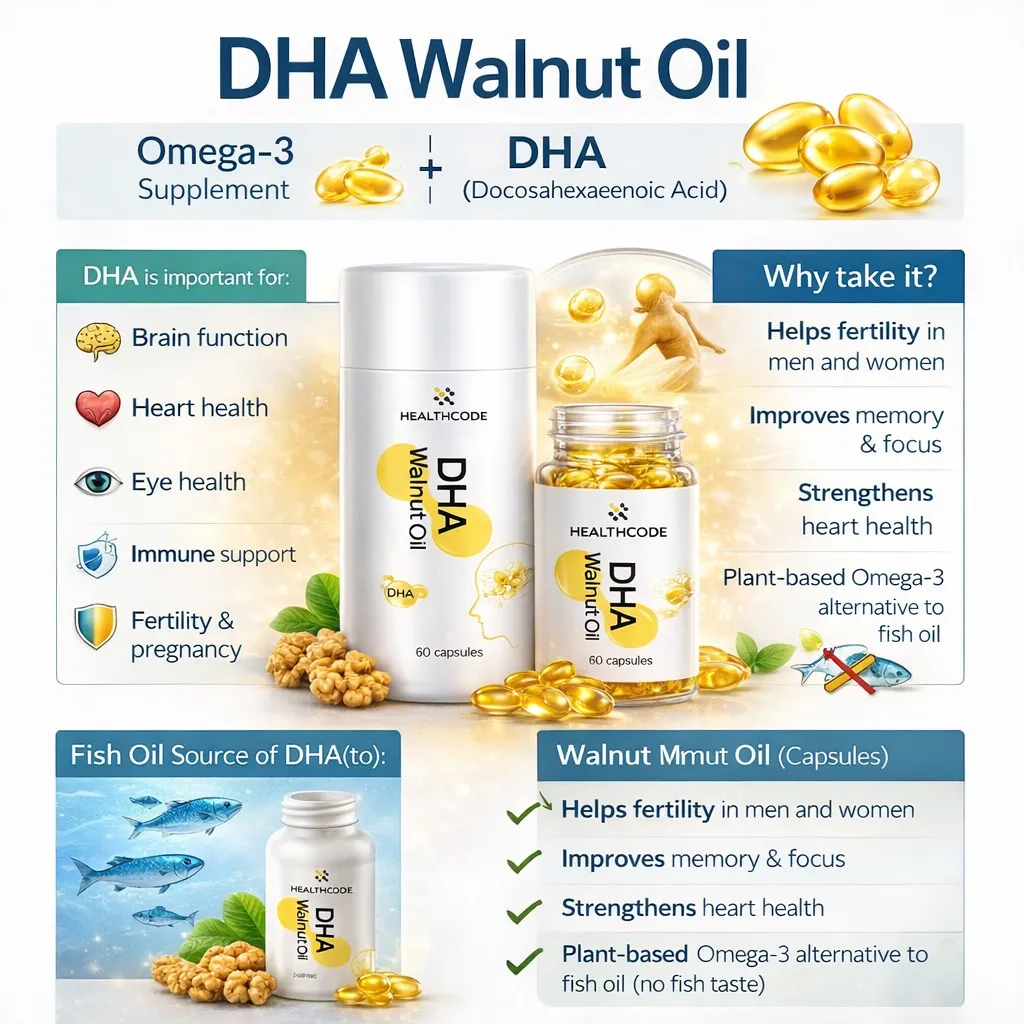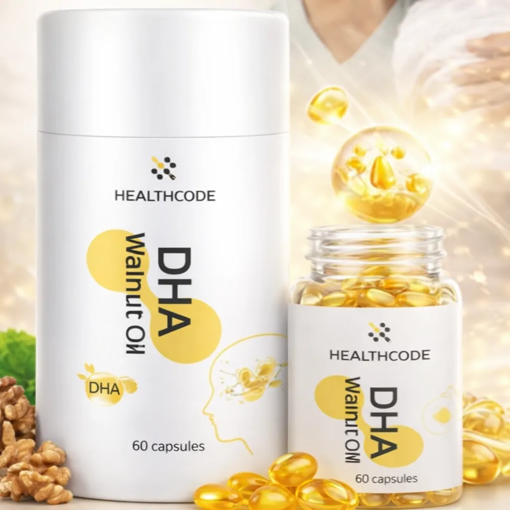 These are premium natural health capsules from HEALTHCODE, made from high-quality walnut extract. Each bottle contains 60 easy-to-swallow capsules packed with DHA and essential omega fatty acids that your body needs but cannot produce on its own.
