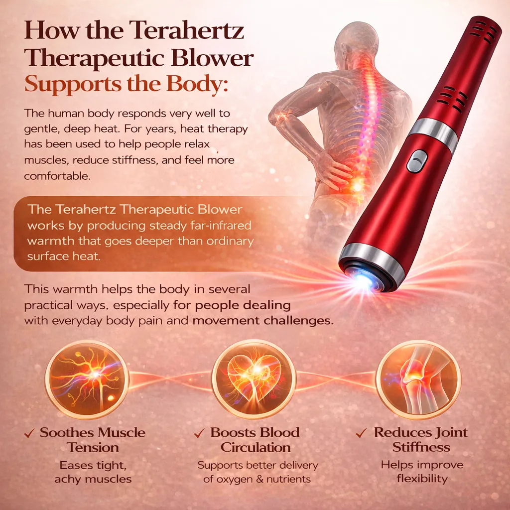 The Terahertz Therapeutic Blower works by delivering deep, gentle heat that penetrates far beyond the surface of your skin. Unlike ordinary heat that only warms the outside, this special far-infrared warmth reaches deep into your muscles, joints, and tissues where pain actually lives.